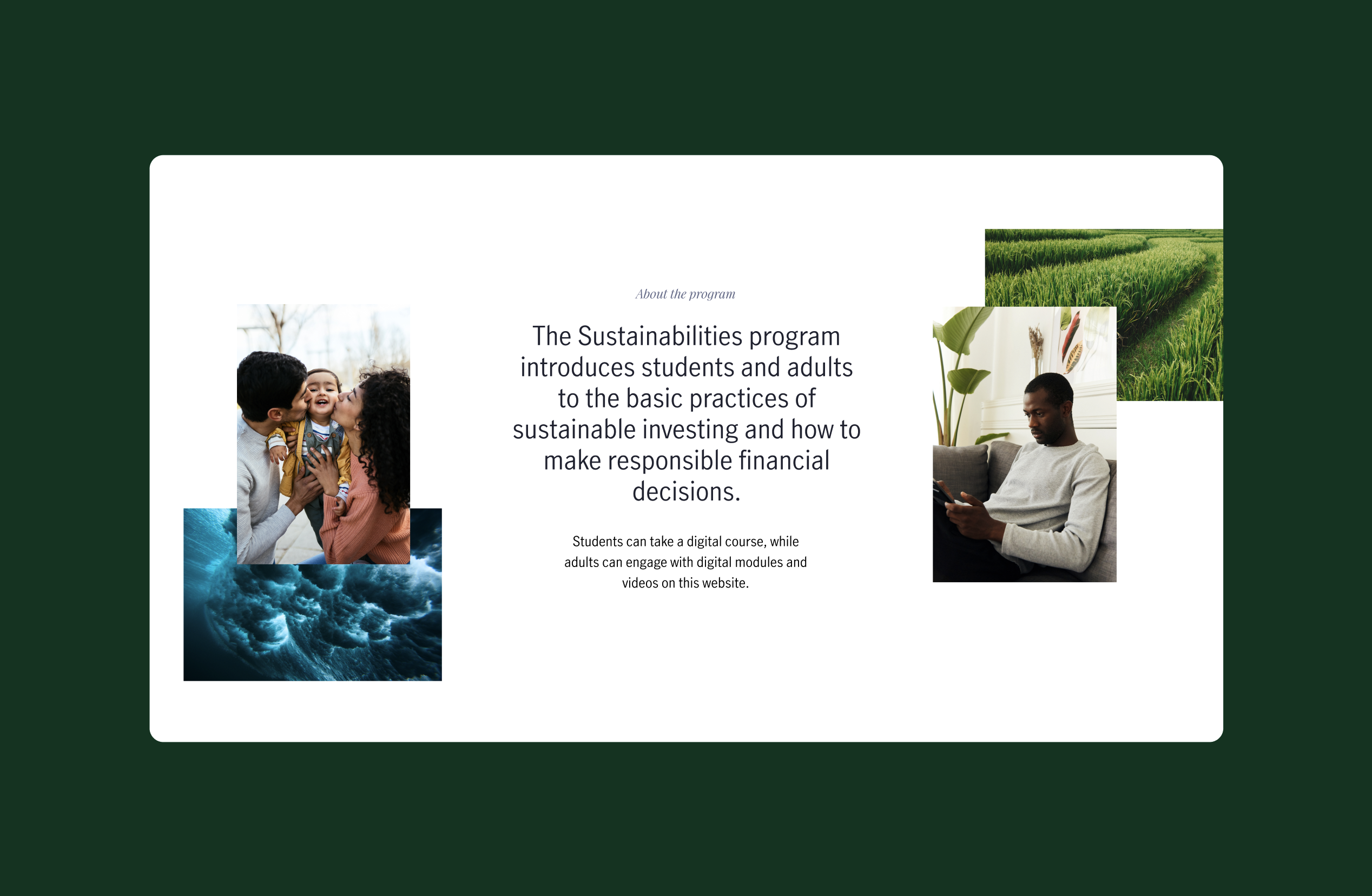 We collaborated with Manulife to launch a new digital platform dedicated to educating people about sustainable investing. The result was a fully responsive website with resources tailored for both adults and students.