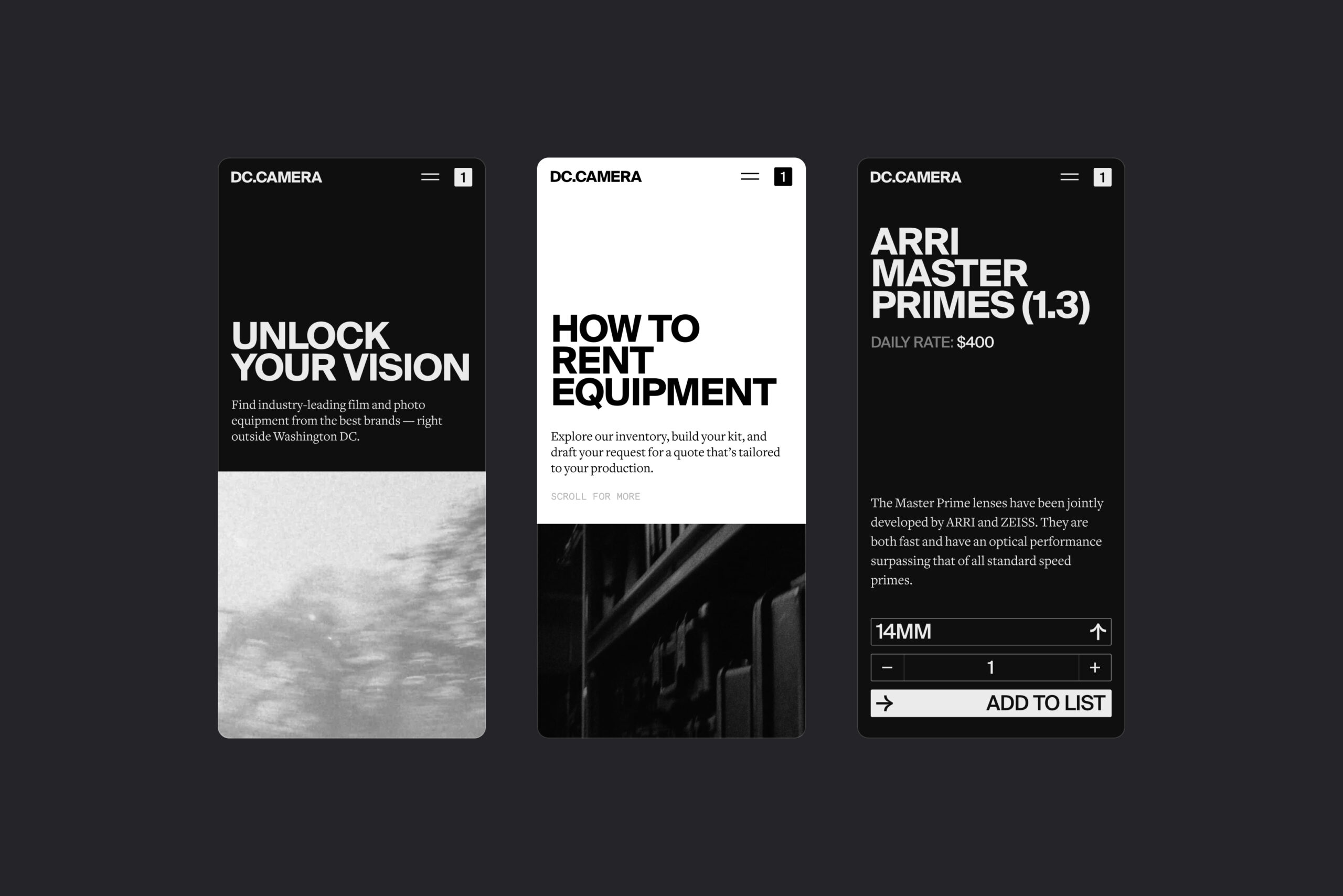 DC Camera came to This January for a full brand and website redesign to help differentiate them from the competition and showcase all the incredible content that can be made with their best-in-class equipment. The competition uses boring, white backgrounds for their websites and photos, making camera gear feel like an afterthought. Our goal with the rebrand and website design was to show that camera gear and eq is the foundation of any good campaign — and customers should never settle for anything but the best.