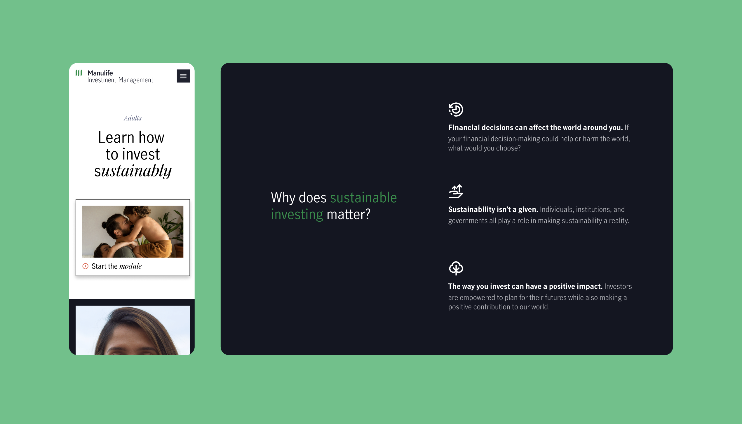 We collaborated with Manulife to launch a new digital platform dedicated to educating people about sustainable investing. The result was a fully responsive website with resources tailored for both adults and students.