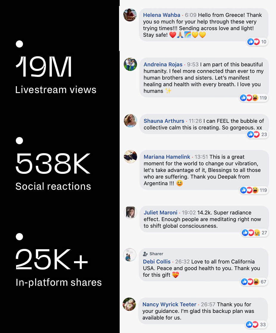 Thanks in part to campaign work from January Third driving attention to the livesteam event, the first platform used to host the meditation crashed under the weight of tens of thousands of visitors that arrived on launch. The event was moved to Facebook Live where, ultimately, the live event was streamed more than 19 million times. The 20 minutes of guided meditation prompted 538,000 social reactions and was shared in platform 25,000 times. The event didn't stop the pandemic but it did bring reflection and calm to millions grappling with anxiety and loneliness across the globe.